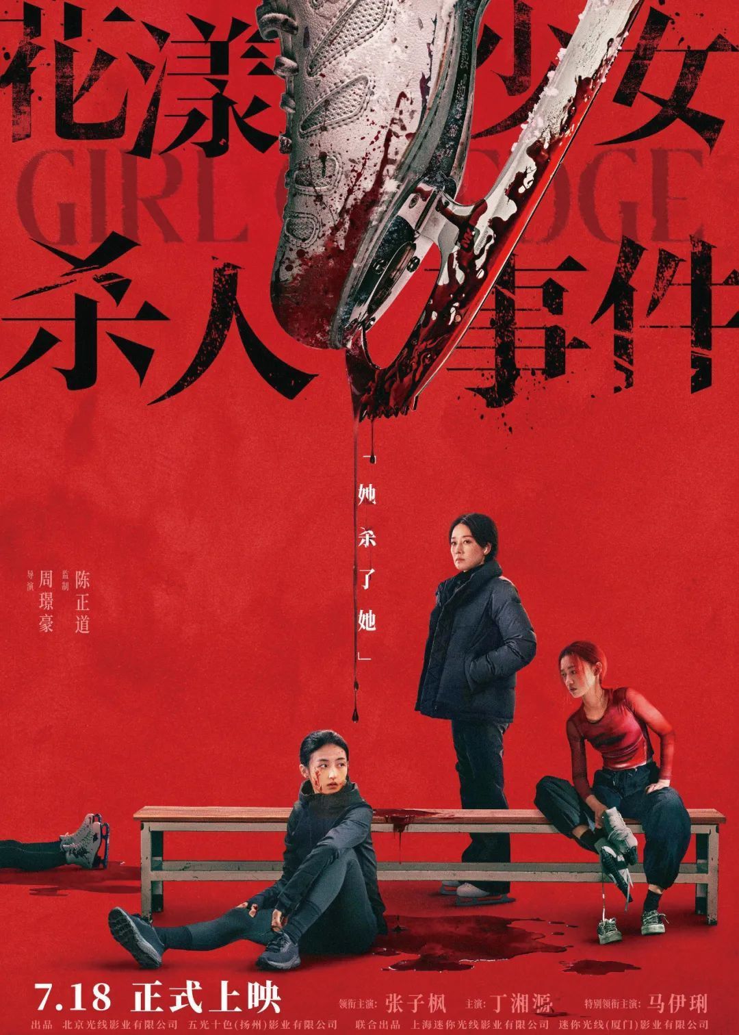 电影《花漾少女杀人事件》拥有一个极具冲击力的开头:女主角江宁(张子枫饰)蹬着锋利的冰鞋在冰上滑行,在经过对手钟灵(丁湘源饰)的身边时,江宁抬脚用冰鞋划过了钟灵的脖颈,钟灵随即倒向冰面翼牛网,脸上混着惊讶和恐惧,血在冰上流淌开来……接着画面一转,时间回到三周前。导演周璟豪由此出发,开始讲述这场“少女杀人事件”的始末,一个关于竞争、压迫以及自我认同的故事。