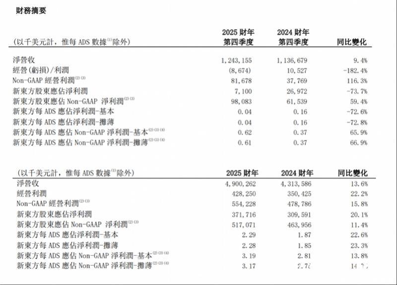 2025财年(2024年6月1日至2025年5月31日),新东方营收49亿美元,同比增长13.6%;净利润3.72亿美元,同比增长20.1%。
